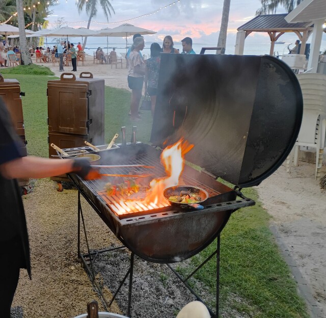 炭火のライブグリルで焼きあがったばかりのステーキやBBQはアツアツでジューシー、野菜やレッドライスの付け合わせも華やかで目を楽しませてくれます。