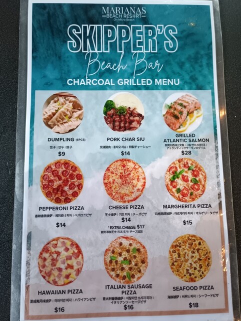 食事はサーロインステーキ($17)、シーフードBBQ串($15)、野菜ケバブ串($10)と、マルゲリータピザ($15)も頂きました。