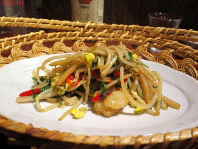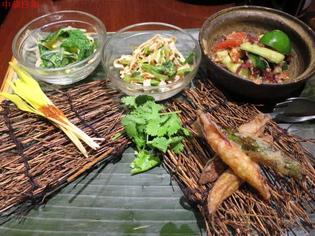 春筍のスパイス揚げ、押し湯葉、佐土原きゅうり北京の辛子油風味、細モヤシ、ミントの西双版納サラダ