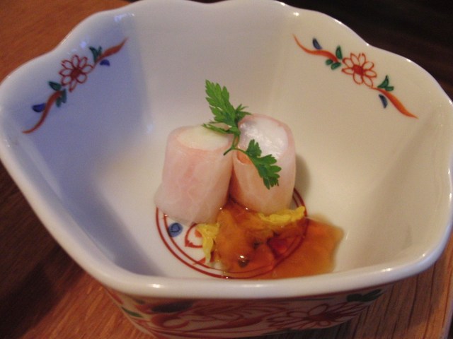 [鱈場蟹絹田巻き、ポン酢ジュレ]