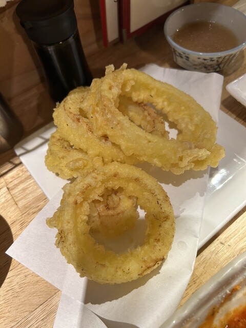 チキンのピカタは揚げたてでジューシー。ユッケ炙りはナムルてんこ盛りで野菜もとれるし、オニオンリングは、ハーフにしたけど、玉ねぎの甘みあってサクサクしてて、オニオンソースとめっちゃ合う!