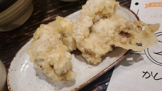 一段落したところで「かしわ天」であります。大きい子供のげんこつサイズのものが2つ。