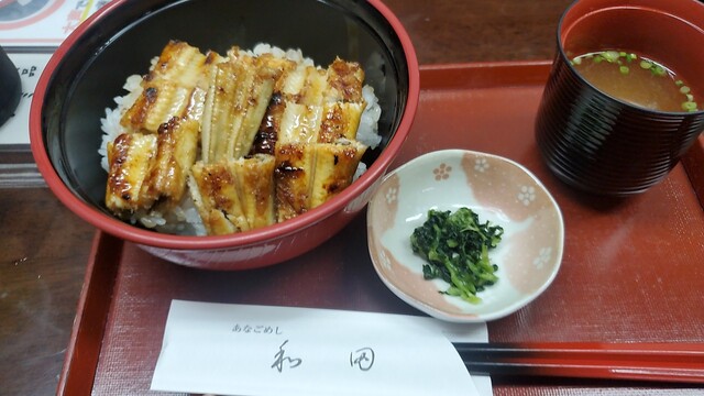 トレイに載ってきたのは「あなごめし」。それから「お味噌汁」に「お漬物の小鉢」の潔い構成なのであります。そして、丼も器も蓋付きであるのが嬉しいのであります。