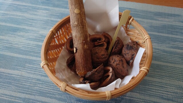 まず、胡桃と擂粉木が配膳され実を掻き出してせっせと集め、すり合わせてつけ汁と合わせるというものです。なかなか楽しい作業です。