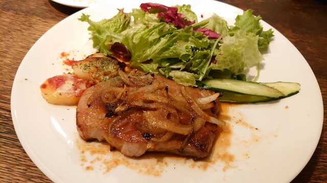 私は豚ソテーの方だったのですが、厚みのある豚にたっぷりの玉葱、その上にジンジャーソースの組み合わせに湧きたちました。