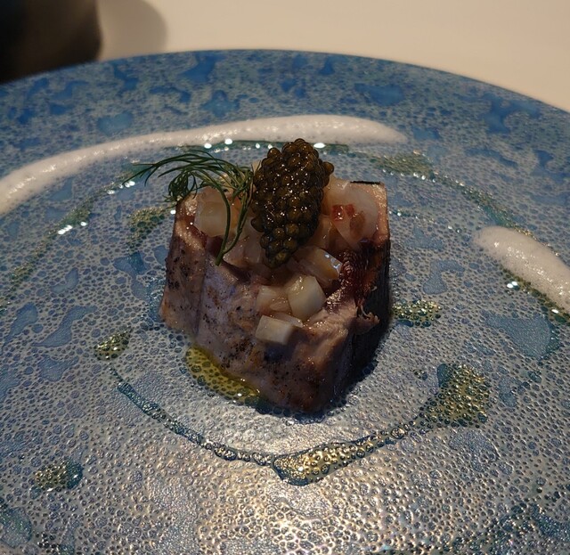 「大船渡本鰹 発酵香味野菜 キャビア」は、そのまま食べても間違いがない厚くカットされた「本鰹」、ウイキョウ、エシャロット、ミョウガ、セロリなどを発酵させた乳酸菌の個性のある酸味、燻製した「キャビア」の塩味、さらにピクルス液の泡も添えられており、それらが口の中で美味しさが流れ込む感じ。