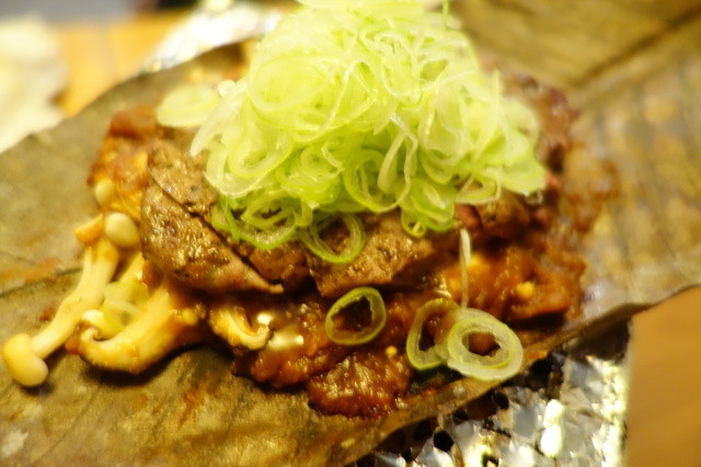 牛肉に朴葉味噌をつけて、炭火で焼きます。これもお酒がすすむすすむ。