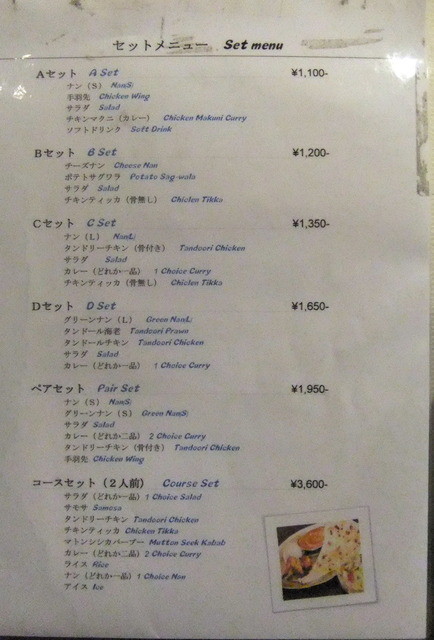 ディナーのセットメニューは、Aセット1100円~ペアセット1950円まで5種類。