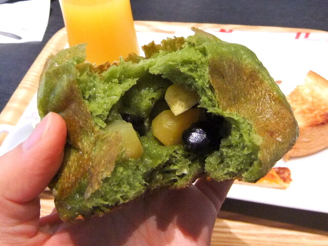 一斤食パンを超ミニサイズにしたような形の抹茶パン、中心にコロンコロンと和栗と丹波黒豆。黒豆がすごくいい味で、あんこに勝るフィリングの役目をしています!