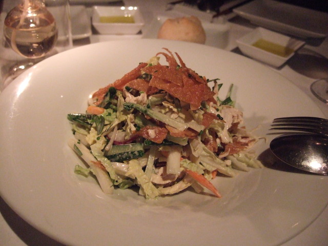 揚げワンタンと中華風(というより和風?とってもさっぱり)のドレッシング、そして少し変わった素材(生の白菜とか・・・)、それらが織りなす味は「ありそうで有り得ない」美味しさ。