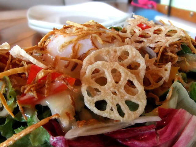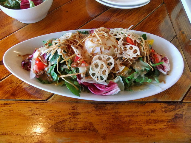 ◆ほうれん草とゴボウチップの温泉卵サラダ600円★4.0(2010/6)