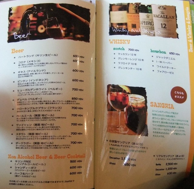 ビール・ウイスキー・サングリアメニュー