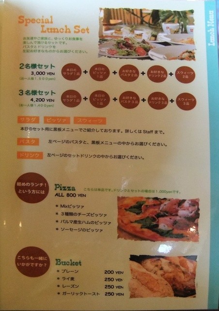 昼は、パスタランチ9種類、ピザランチ6種類、プレートランチ4種類、選べるランチセット(2名セット・3名セット)。
