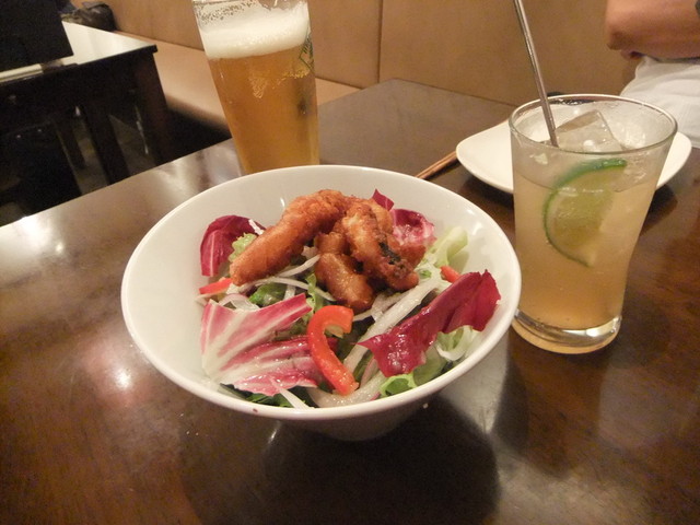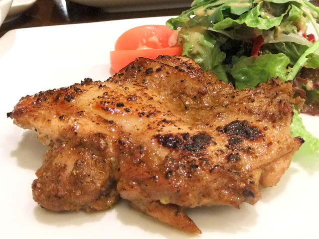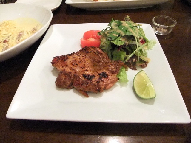 やわらかな鶏もも肉のローストチキン(フライドチキンのスライスのようでしたが…)と、さっぱりさわやかドレッシングが美味しいグリーンサラダです。