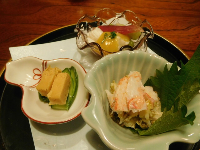 毎度のお楽しみ八寸は酒飲みにはたまらない。酒肴三点はまんぼう酢味噌、豆腐味噌漬け、毛蟹とこれまた酒が進む。地のもの中心でお願いされたので・・・とつけていただいた殻付き雲丹はあっさりとした風味の奥に昆布の旨味が微かに漂い、高貴な味わい。