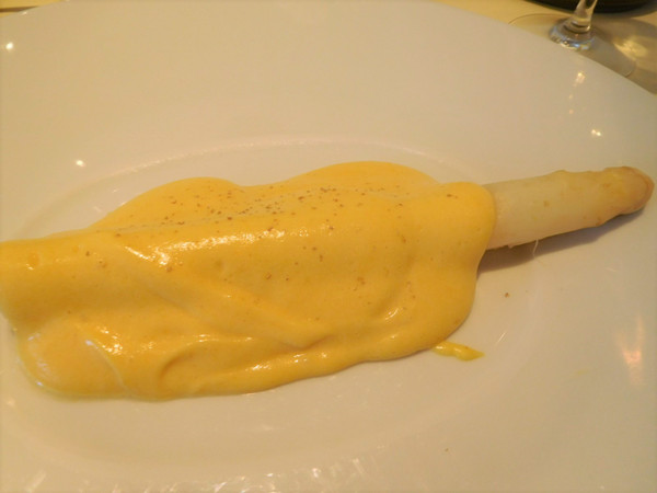 温前菜は食べられたらいいなぁと思っていたホワイトアスパラガスのマルテーズソース。マルテーズソースというのは、オランデーズソースとは違ってオレンジの果汁で仕上げたものとのことで、なるほど春の陽光を思わせる橙色が際立って美しく、また穏やかな酸味がどこかほのぼのとした春の陽気を連想させるものでとても良かった。