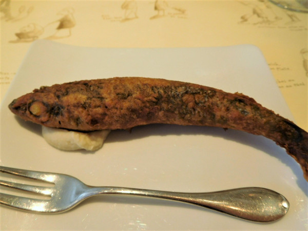 アミューズはめひかりのベニエに白インゲン豆のマッシュが添えられた一品。今まで見たことがないような大きさのめひかりで期待が高まるが、これは流石に大きすぎたようで、どうしても骨が気になってしまいちょっと残念。あの身の霧散ぶりを味わうにはもう少し小さい魚体でなければならないようだ。大丈夫かな・・・と少し不安がもたげたところで、鰹のマリネと春野菜のサラダ仕立て。