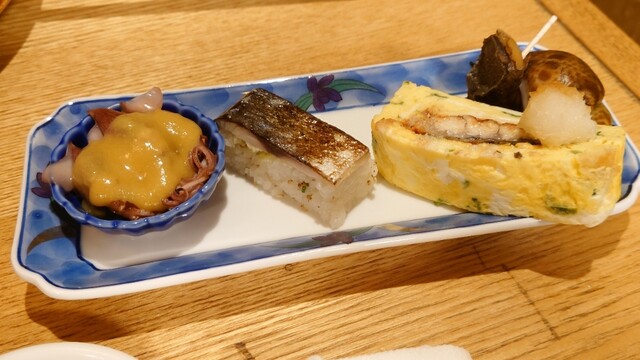 前菜(蛍烏賊酢味噌、焼き鯖寿司、う巻き玉子、煮貝(バイ貝))