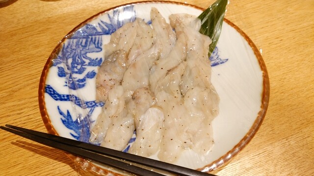 河豚刺しは、身が厚くて旨味十分の物。