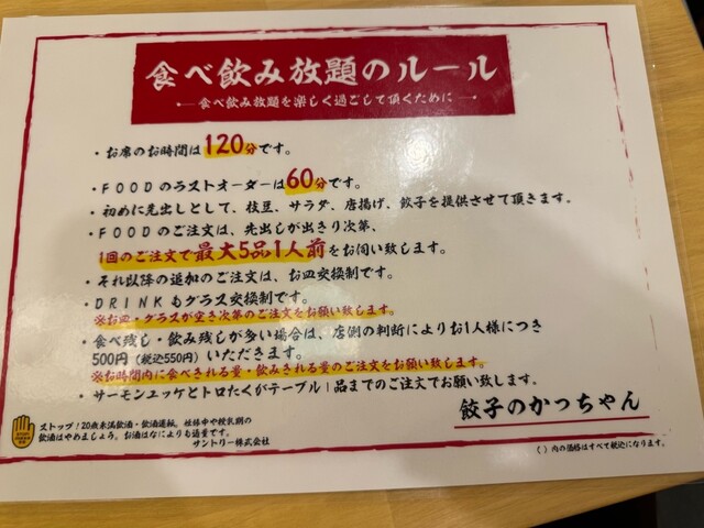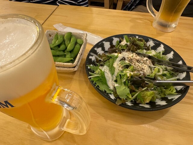 最初にサラダ・枝豆・餃子・唐揚げが出てきて、これを食べ終わってから、好きなオーダーができるパターン。