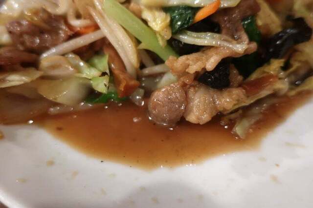 シャキシャキの野菜、木耳、蒲鉾、プリプリのムキエビとイカ。