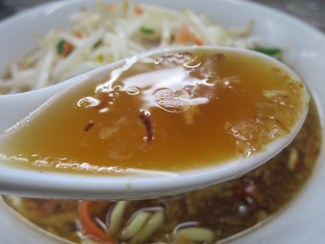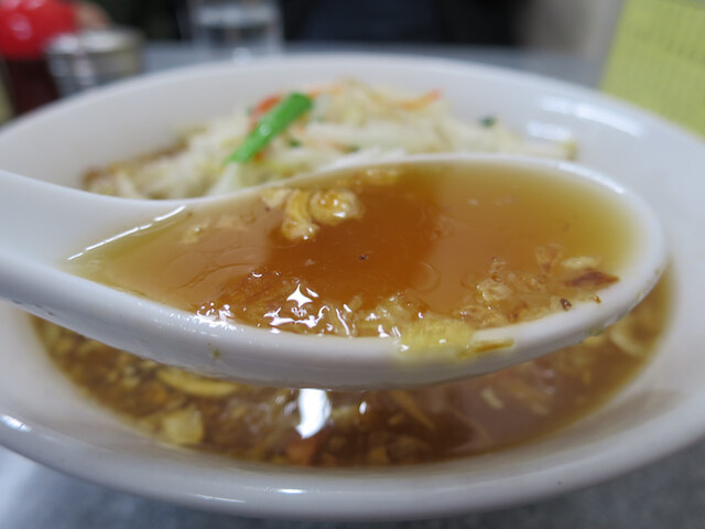 硬いごはんの上にタレを絡ませた野菜炒めをバウンドさせて。