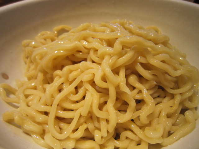 太めの縮れ麺。モチっとして歯ごたえ十分。味もイイ!