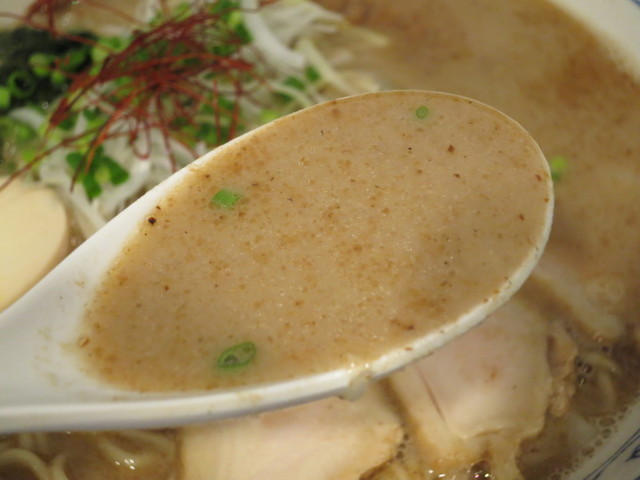 魚出汁が合わさった芳ばしい~濃厚鶏白湯スープ。 思ったほどクセがなくマイルドな味わい。
