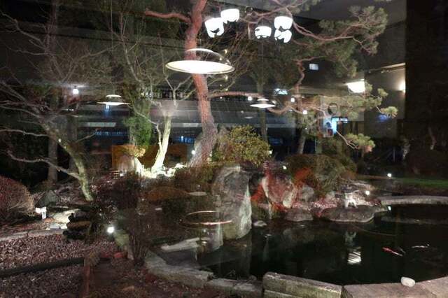 大きなガラス越しの向こう側はライトアップされた庭園。