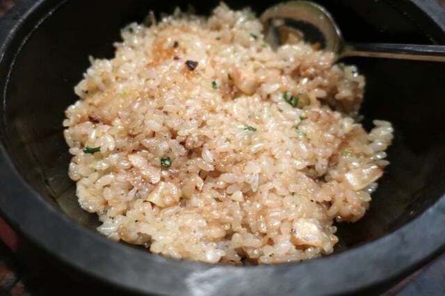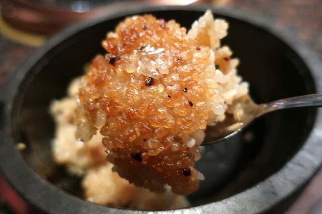 ガーリックライスをスプーンで石焼鍋の底にプレスして。