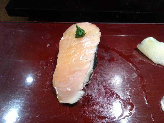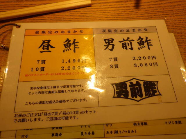 「大名古屋ダイニング」の中の一店「築地 男前鮓」でランチをいただくことにしました。5人ほどしか並んでいませんでしたが、小一時間待って着席できました。「昼鮓(10貫)」2200円を注文しました。「昼鮓(10貫)」は桜サーモン、「カンパチ漬け」、「白身昆布〆」、「本日の青魚」、「赤海老漬け」、「男前赤身」、「イカ」、「中トロ」、「カンパチ漬け」、「炙り鮓」、「玉ネギトロ手巻」というラインナップでした。どのネタもひと手間加わっていてとても美味しかったです。「苦手なネタは2種類まで変更できます」ということでしたが、どれも捨てがたい旨さでした。多少並んでもまた食べたいです。