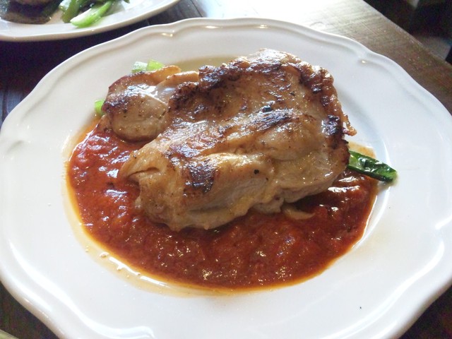 ・「若鶏のオーブン焼き」は意外とボリュームがあり、炙られたモモ肉の皮はパリパリ。
