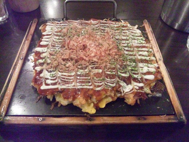 青のり、鰹節が掛かっています。なお、ヘラで切り分けて食べるタイプです。