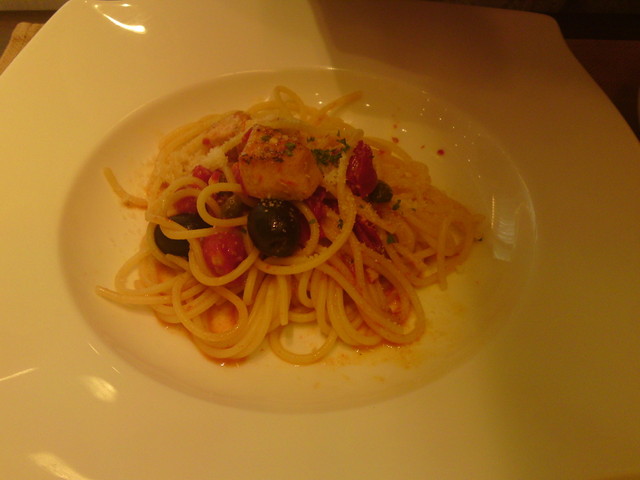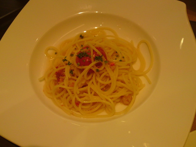 ⇒小さな蟹の身と大きなトマトが1つ。トマトは甘いが、蟹とパスタだけと言う感じ。残念な味。