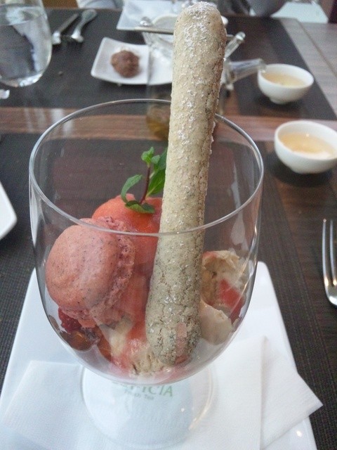 ⇒シャンパーニュロゼのアイスとジュレ、イチゴのアイス/マカロン、抹茶のビスキュイが載ったパフェ。