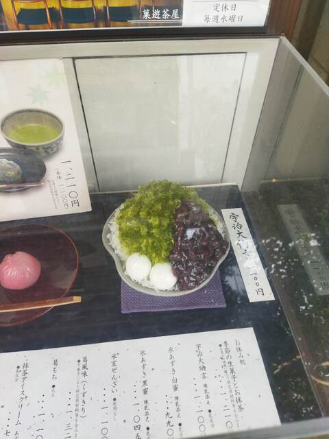 宇治大納言かき氷 1100円 熱いお茶 冷たいお茶 練乳付き