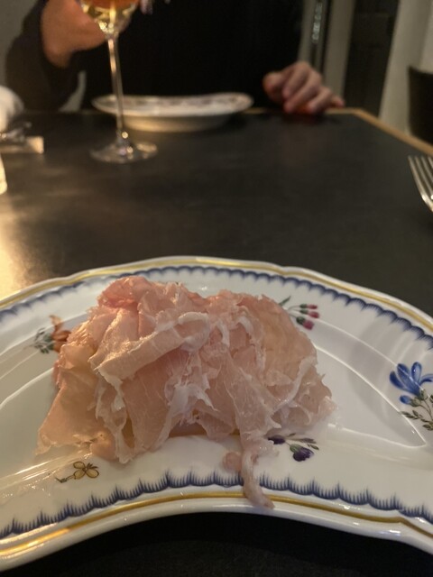 揚げ油がオリーブ油なのか、温度に物凄く気を遣っている。おそらく油の揮発温度の違いで天ぷらみたいに高温にしちゃうと油がダメになっちゃうからかな? 後、全体こんがり感をきれいに出すためか意外と攻める。思ったよりも物凄く精緻に揚げるのね。カリッと軽く揚ったニョッコに無茶苦茶薄く削いだ生ハムを丁寧に纏わせるように載っける。こんなん旨いに決まってるやんけ。