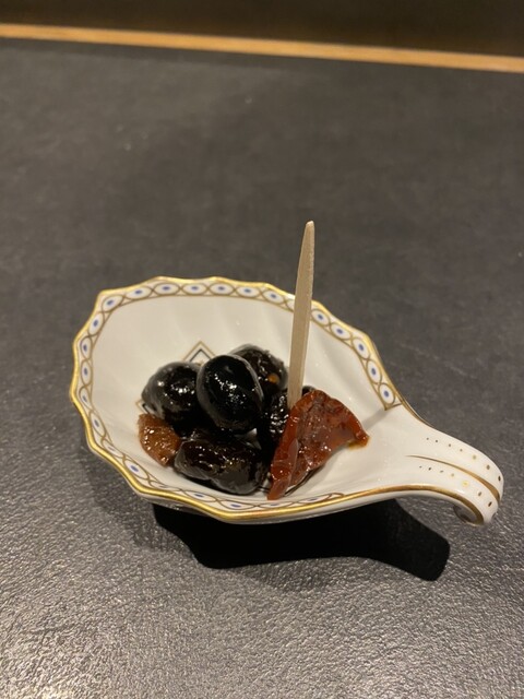 まずは名刺代わりのアミューズドライトマトとオリーブ。まずのっけからバカ旨い。なんなのこの味。物凄く変なこと言ってるという自覚はあるんだが、異常な旨みが香港の高級店の手作り珍味みたいなのよ! でも、そんな不思議感をちょっと纏いながら、もちろん旨いイタリア料理として成立している。破綻感ゼロ。