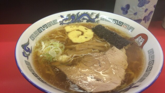 今日の醤油ラーメンはいつもの通り透き通ったスープに、伊達巻と海苔とメンマのトッピング。