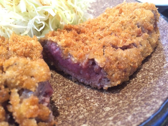 一緒に行った仲間が初めての牛カツで旨いと感激している。