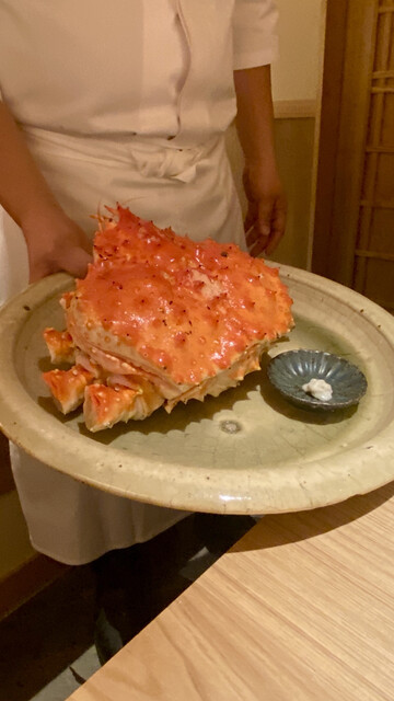 やがて氷を敷いた桶が運ばれ、堂々と横たわる3kgの活タラバが登場。