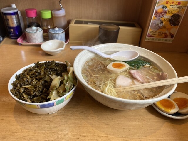 高菜は調味料と豚で味付けされ、まろやかで万人受けする味で納得の値段です。最後は塩ラーメンのスープを入れて雑炊にして食べると美味しさ抜群です。