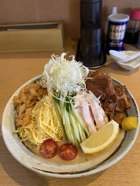 プチトマト、レモン、錦糸タマゴ、キュウリ、白髪ネギ、ニンジン、クラゲ、角煮、鶏チャーシュー、揚げ玉