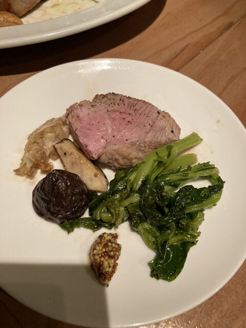 仔羊モモ肉のロースト3000円、厚めのお肉が数切れと野菜のソテーが添えられてでてきました。コレはお皿に取り分けた写真です。