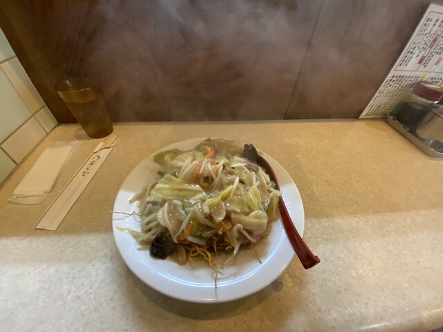 '25/07 いつものように週末ひとりランチ訪問。熱帯夜と猛暑日が続く日々、体調管理なんて並のことしたくらいじゃ通用しない異常気象。そんな時は「目の前で揚げたて」で作って頂ける「細麺パリパリ皿うどん」がオススメ。わけぎの入った「青ネギ皿うどん」の香りはステキだが「ウスターソース」に負けてしまうので今回は「ウスターソース」優先でデフォの「皿うどん」(細麺パリパリ)をお願いした。汁ありちゃんぽんに合うか否かは個人の好みだが「細麺皿うどん」で、まだ試したことがない方には是非「ウスターソース」をオススメしたい。ちょっと垂らして食べてみて、更にもうちょっと垂らしてお好みで食べてみて頂きたい。汁ありちゃんぽんと異なり砂糖で甘めに味付けての餡がかり。いつの間にか「虜(とりこ)」になっていること請け合い。但しコレは「業務用の揚げ置きモノ」にはオススメしません。揚げたてだからこその風味であって揚げ置きでは、脂臭さを増強してしまうから・・・。ま、その辺も含め「お好みで」・・・。試したことがないけれど「エビ」なんかはダメだと思うけど「青唐辛子」や「ガーリック系」のような「個性的なモノ」ならウスターに負けないので試す価値はありそう・・・。自分の後に、ガッツリ系男性4名様来店オーダーは「ちゃんぽん4人前」。久々にひとつ鍋で4人前ちゃんぽん同時調理を観せて頂いて、お会計。