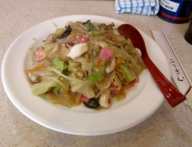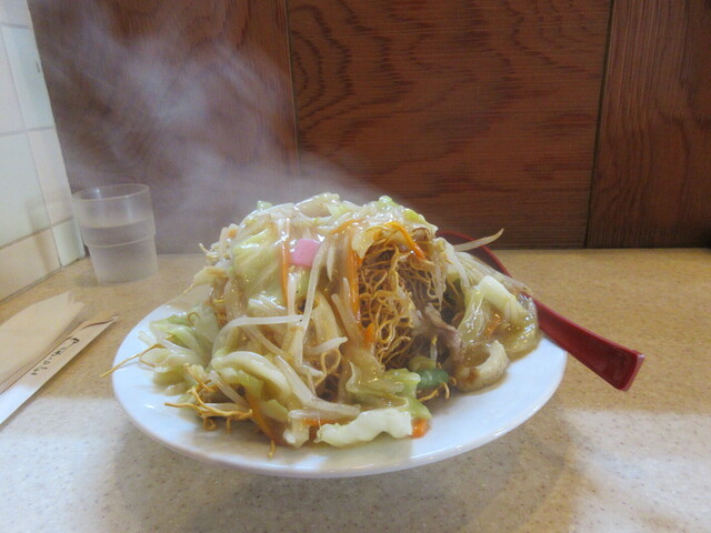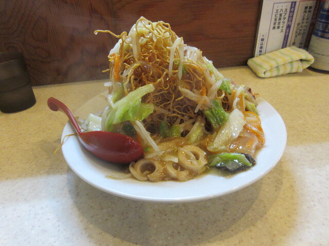 '24/09 いつものように週末ひとりランチ訪問。ほぼ開店時間に入店。先客様2名2組。オーダーはまだの様子なので、ソチラを聞いて「便乗」して複数人分、同時調理で早々に喰うなど、自分のオーダーを決めようと・・・。残念ながら「太麺」が優勢で、ならば社長には申し訳ないけれど「ワタシのためだけ」に「普通の皿うどん」を作って頂くコトにした。一人分のために、その都度、丁寧に麺を揚げ、具を炒め鍋を振り、水溶き片栗粉で餡がかりにして皿に盛る。作り始めてしまえば、途中で「二人分」に増量することは出来ず、コ口ナ前のように「鍋振り二人態勢」ではない現在は、一人分ずつ火の前に立って鍋を振り続けなければならない。途中で「豚味噌定食(豚肉とキャベツの味噌炒め定食)」なんてオーダーも入るので、同時進行も難しい。ってことで「ワタシのためだけの皿うどん一皿」到着。揚げたてで丁寧に盛り上がった仕上がりの麺、たっぷり野菜で少し甘めの餡がかり。途中ソースで味変。関東ではかたやきそばには「酢辛子」だが甘めの長崎皿うどんにはソースが合う。いつもながら美味。