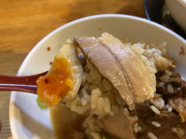そして残しておいた温玉とともに、ライス投入の儀式です。スープの残量がちょうどよく、スープを吸ったライスを美味しくいただくと、どんぶりの中は何もなくなってしまい完食でした。温玉の黄身がライスとスープとからんで、ピリ辛具合がすごくマイルドで美味しくなります。と言いつつ、途中からニンニクラー油を結構入れてしまいましたが...