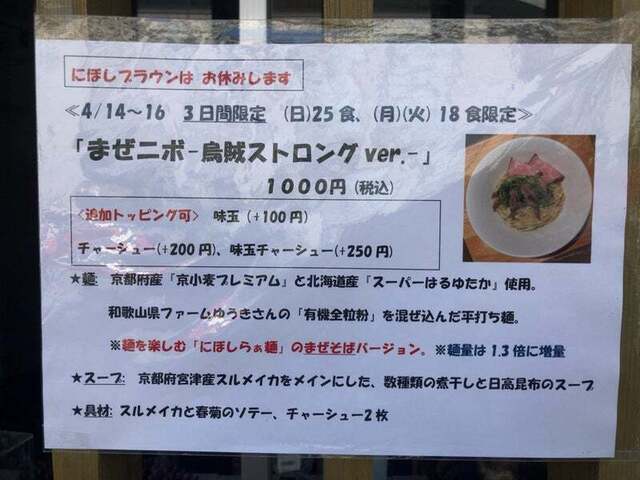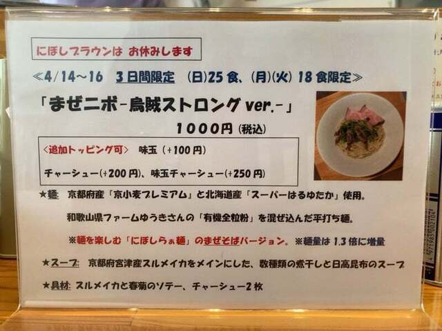 店前に貼られたメニューを確認すると、3日間限定麺は、『まぜニボ−烏賊ストロングver.−』でございます。