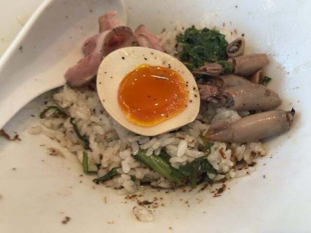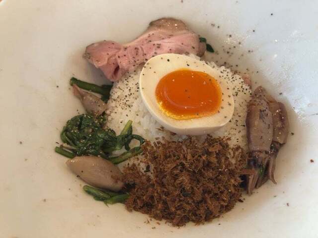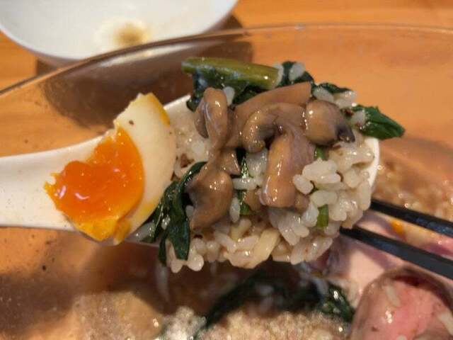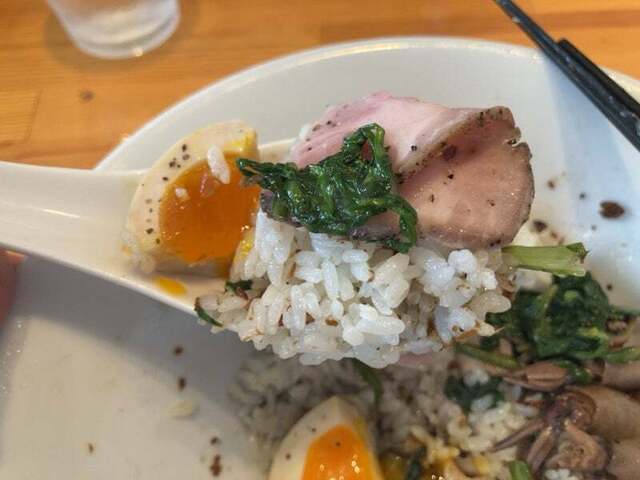 極上の煮干しスープの旨みをたっぷりと纏ったライスに、肉の旨みと甘み、マイルドな黄身のコク、上品な鰹節の風味と酸味、ブラックペッパーの風味が素敵なハ~モニ~を奏でて、これはもう旨すぎるっ!
