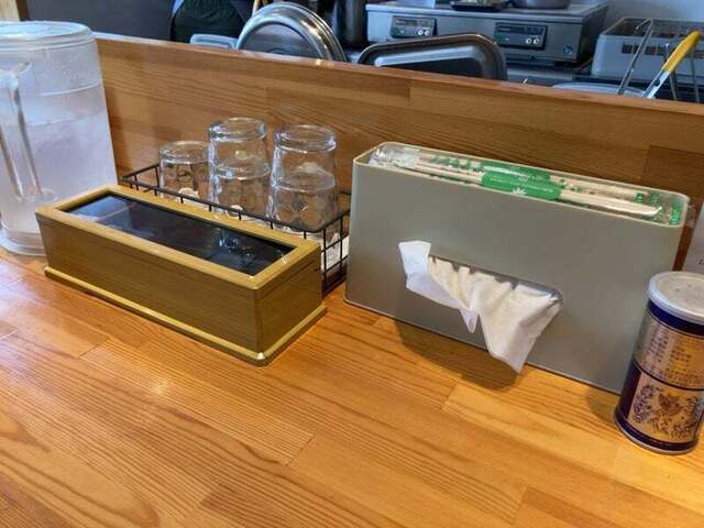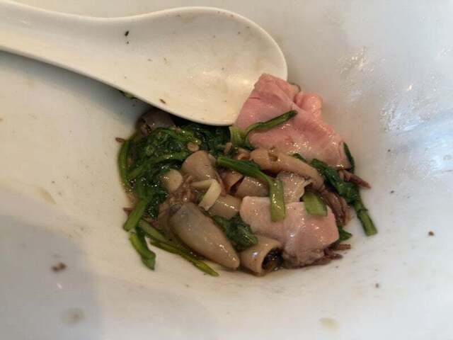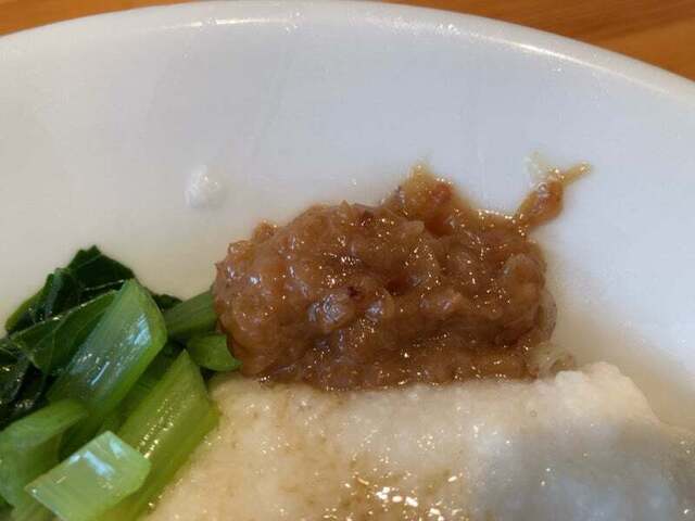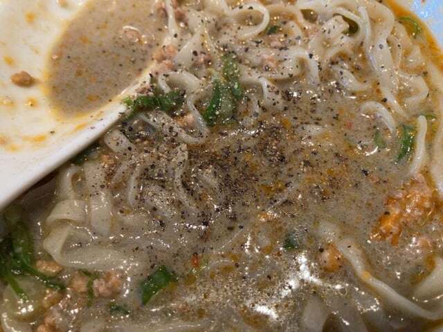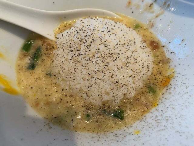 途中でご飯に付いてきた自家製ふりかけと卓上のブラックペッパーを投入すると、自家製ふりかけとブラックペッパーの風味が引き立ち、スープがより一層キリッとコク深くなって、味変大成功~!